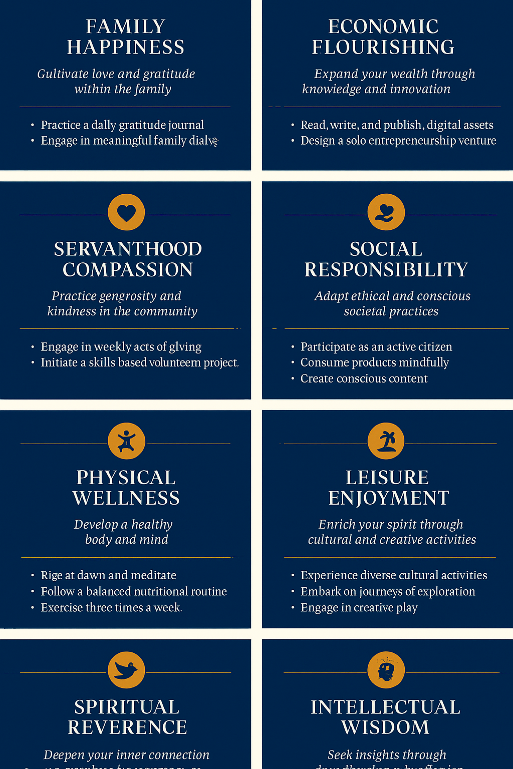 동방의 등불 삶의 8진법은 단순한 루틴이 아니다. 이것은 하나의 인생 청사진이며, 어떻게 시간과 노력을 집약해서 일할 것이고 그 외의 시간은 또 어떻게 밀도있게 보낼 것인지에 대한 자기만의 기준을 세운다. 인간 내면의 근원적 힘을 깨우는 기준이 균형 있고 조화로운 상태가 바로 인생의 황금비율이다. 조화의 철학과 창조의 원리이다. 그 어떤 운명도, 그 어떤 불확실성도, 창조하는 삶(Creative Life)을 실천하는 자의 앞을 막을 수 없다.