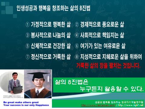 지구촌 인류의 성공과 행복을 창조하는 동방의 등불 삶의 8진법은 인간미·도덕성·예의범절의 토대 위에 겸손과 나눔, 사랑과 봉사의 실천으로 ① 가정적으로 행복한 삶, ② 경제적으로 풍요로운 삶, ③ 봉사적으로 자비로운 삶, ④ 사회적으로 책임 있는 삶, ⑤ 신체적으로 건강한 삶, ⑥ 여가적으로 즐거운 삶, ⑦ 정신적으로 거룩한 삶, ⑧ 지성적으로 지혜로운 삶으로, 가치 있고 품격 있는 삶, 건강하고 행복한 삶, 우아하고 거룩한 삶을 살다가 사회에 유산을 남기는 창조하는 삶(Creative Life)이 바로 '동방의 등불 삶의 8진법'이다.