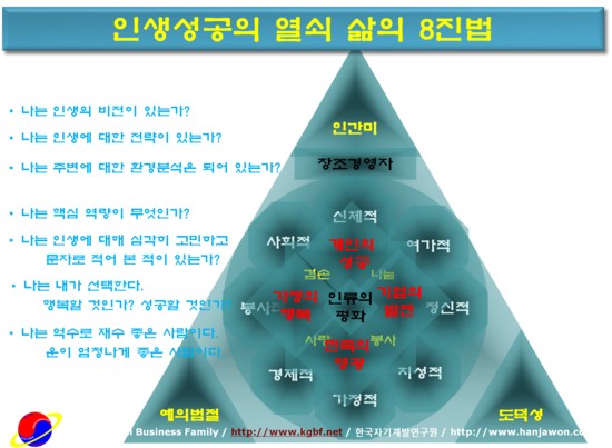 ⓒ 사상가와의 협력 : 세계적으로 영향력 있는 사상가, 철학자, 자기계발 전문가들과 협력하여 그들의 강연, 저서, 연구를 통해 창조경영자 비전과 삶의 8진법 가치를 전 세계에 확산시킬 수 있다.